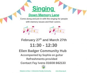 Come along and join in with the singing for people with memory issues and their carers. February 27th and March 27th 2026 11:30 - 12:30...
