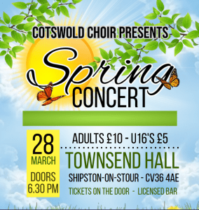 Cotswold Choir Presents - Spring Concert The Townsend Hall in Shipston 28th March 2026 at 6:30pm Tickets available on the door Adults - £10 Under...