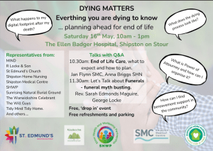 A support group for people at any stage of bereavement. First Tuesday of the Month, 11am-1pm 7th April, 5th May, 2nd June 16th May- Dying...