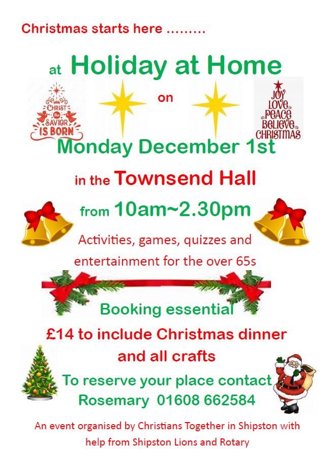 Christmas starts here at Holidays at Home, in the Townsend Hall, on Monday December 1st, from 10am-2.30pm. Activities, games, quizzes and entertainment for over 65’s. Booking essential.