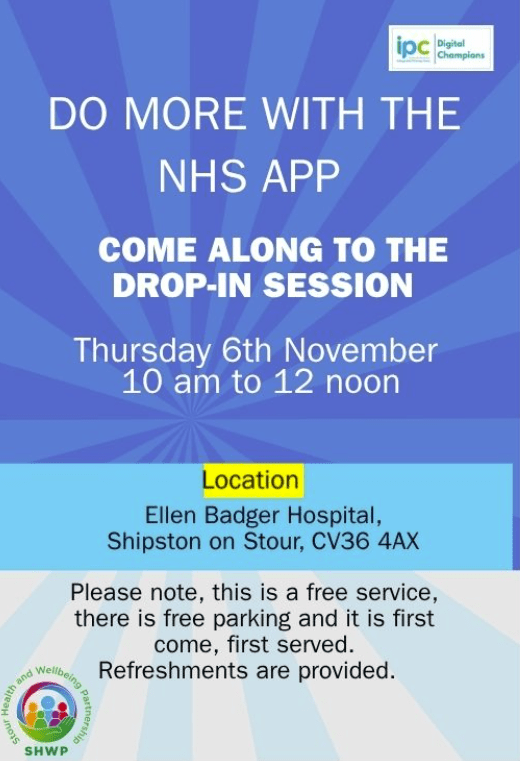 Do more with the NHS App! Come along to the Drop In Session, on Thursday 6th November, 10am – 12 noon