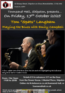 Townsend Hall, Shipston on Stour presents: Tom "Spats" Langham, playing the Blues with Emily Campbell. Friday 17th October Doors open at 7pm for 8pm start....