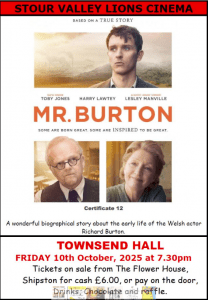 Stour Valley Lions presents Mr Burton. A wonderful biographical story about the early life of the Welsh actor Richard Burton. At The Townsend Hall, Friday...