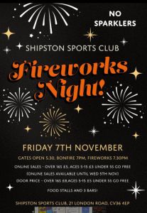 Shipston Sports Club Fireworks Night! Friday 7th November. Gates open 5.30pm, Bonfire at 7pm, Fireworks at 7.30pm. NO SPARKLERS PLEASE! Food stalls available and 3...